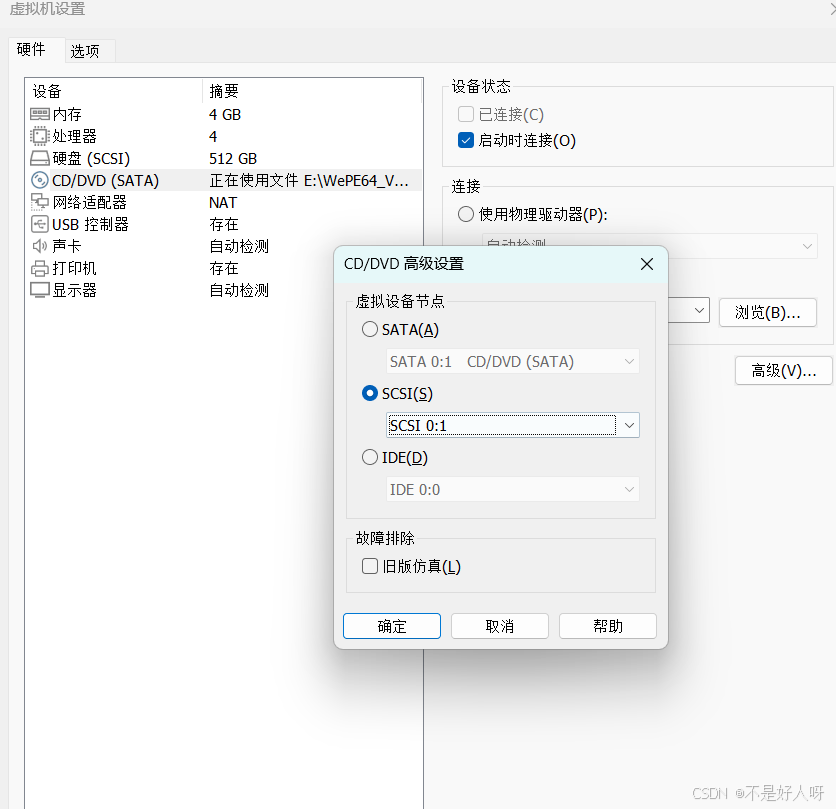 10.打开虚拟机设置看虚拟机硬盘格式和虚拟设备节点是否对应(原版虚拟机底层忽略这一步,修改过的虚拟机底层需要看看,不然安装不了系统)