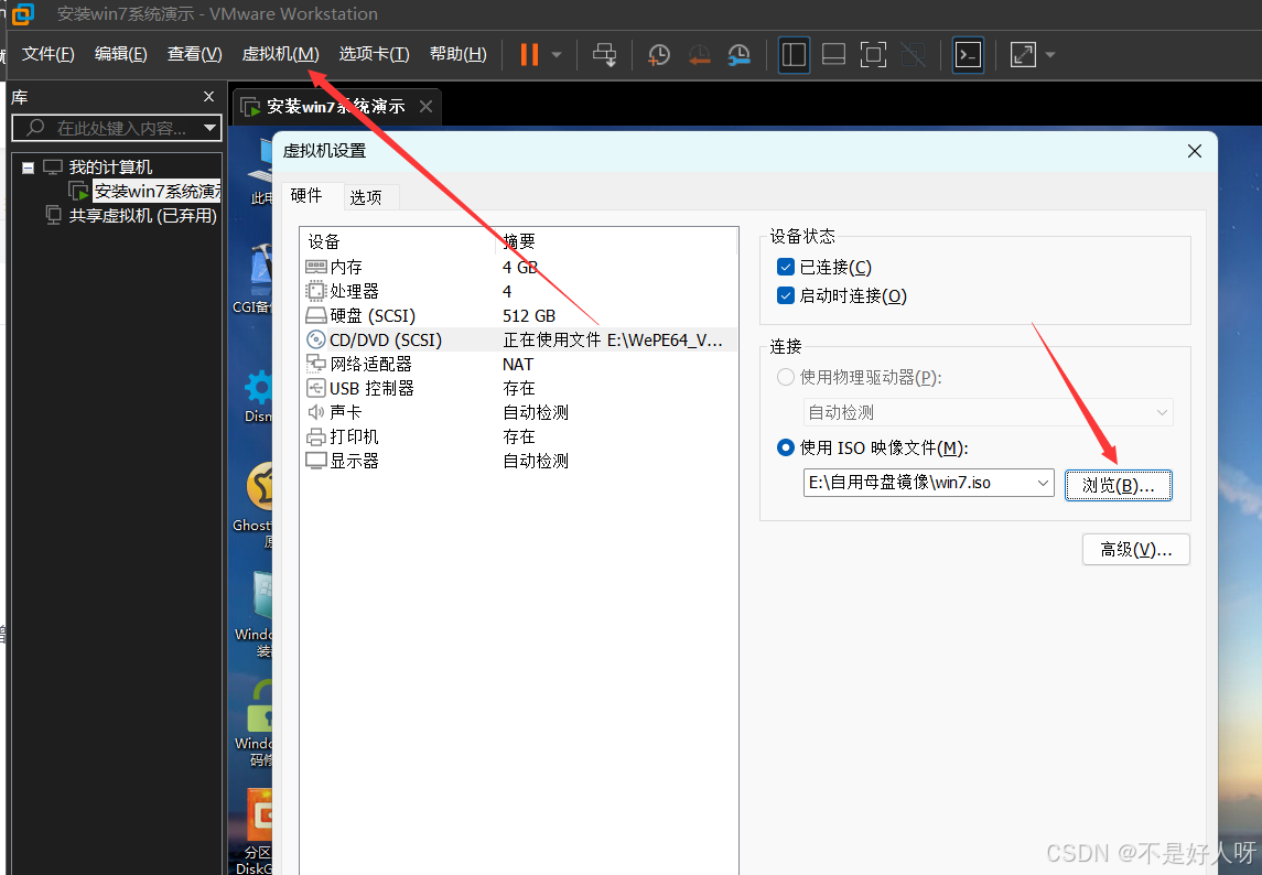 13.点击虚拟机顶部虚拟机选项选择可移动设备浏览选择要安装的win7镜像