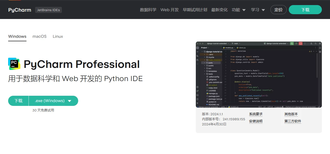 1.先去IDE官方下载你需要的软件,这里以Pycharm为例,因为此方式适用于所有全家桶激活。这里以最新版2024.1为例,此方式适用于所有版本,并支持新版。