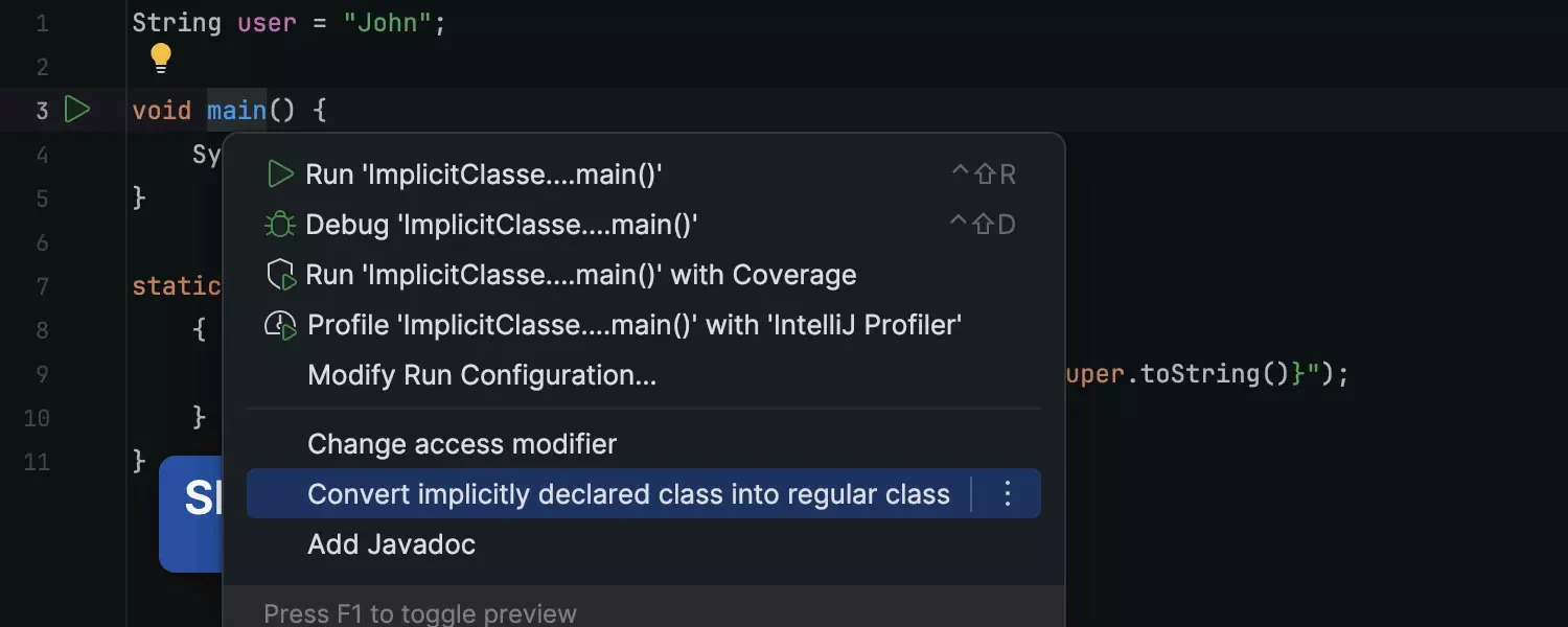 IntelliJ IDEA 2024.1 提供了对 2024 年 3 月发布的 JDK 22 中的功能集的支持, 支持覆盖未命名变量与模式的最终迭代、字符串模板与隐式声明的类的第二个预览版,以及实例 方法。 此外,此更新还引入了对 之前预览状态下的 new 语句的支持。