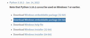 (3)点开之后,你会发现有很多python版本,我们当然要选择python 3.X版本,因为python 2.X版本官方已经不再维护了。但我也不建议大家选择最新的版本,因为很多第三库还没有兼容,所以可能会导致运行报错,在这里我们选择3.10.2.版本。 Windows embeddable package (64-bit)下载链接。