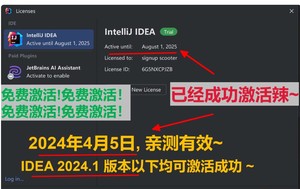 IDEA 迎来了 2024 大版本的更新。又回到老话题,2024.1 这个版本是否还能激活成功教程,笔者也亲测了一下。还是沿用本站之前的激活成功教程方式,亲测依然有效,可以激活成功教程到 2025 年(实际是永久激活,只是这样会低调一些,防止被官方针对),无图无真相,下面是我激活成功教程成功的截图: