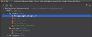 现在可以在"Compare with branch"对话框中复制另一个分支的文件。为此,选择要复制的文件,然后"Show diff"旁边的新的向下箭头图标。