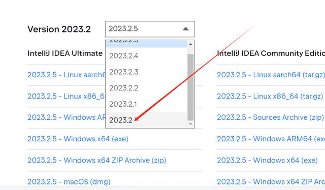 - 下拉旁边的下拉框,找到【2023.2】,然后选择与您的操作系统相对应的版本进行下载。